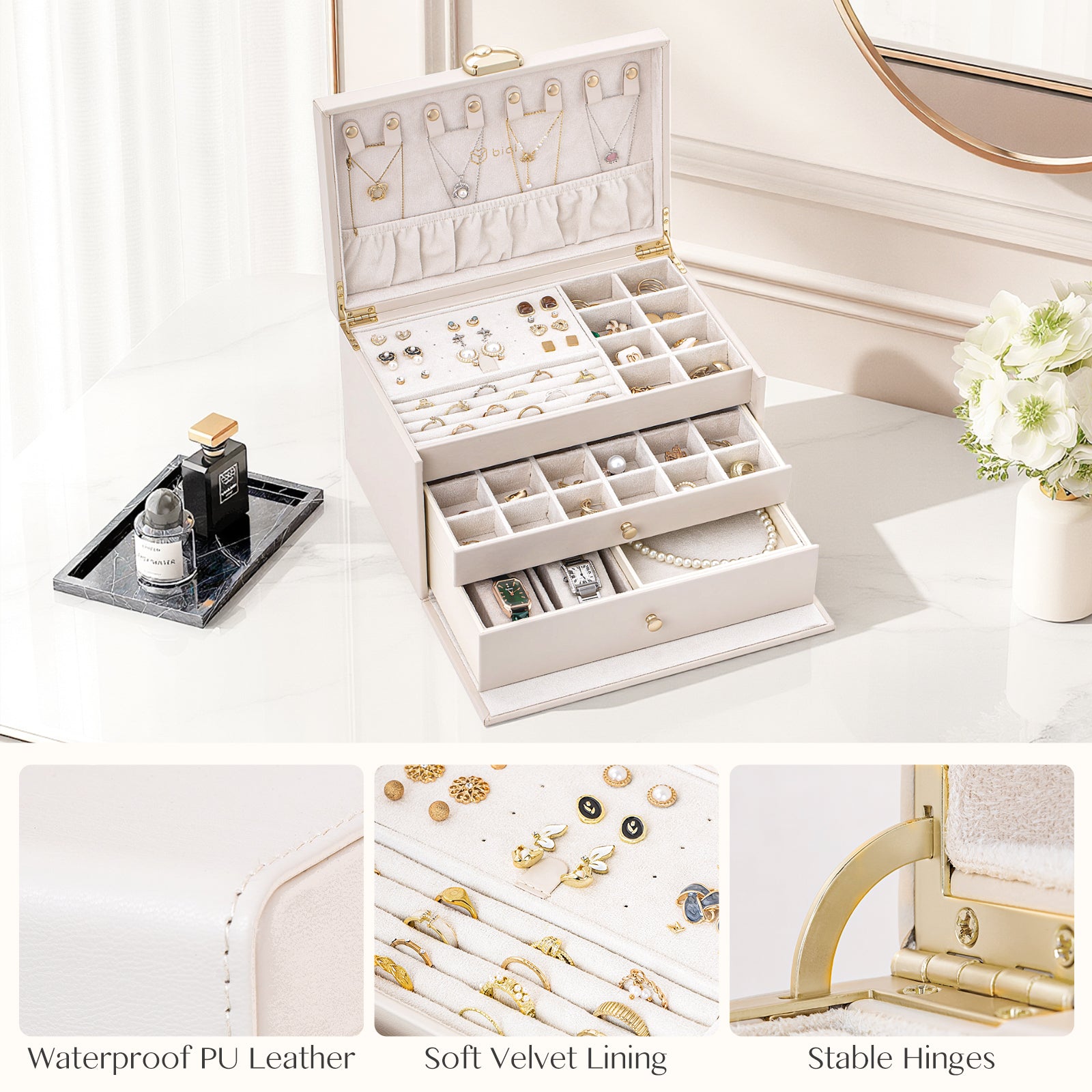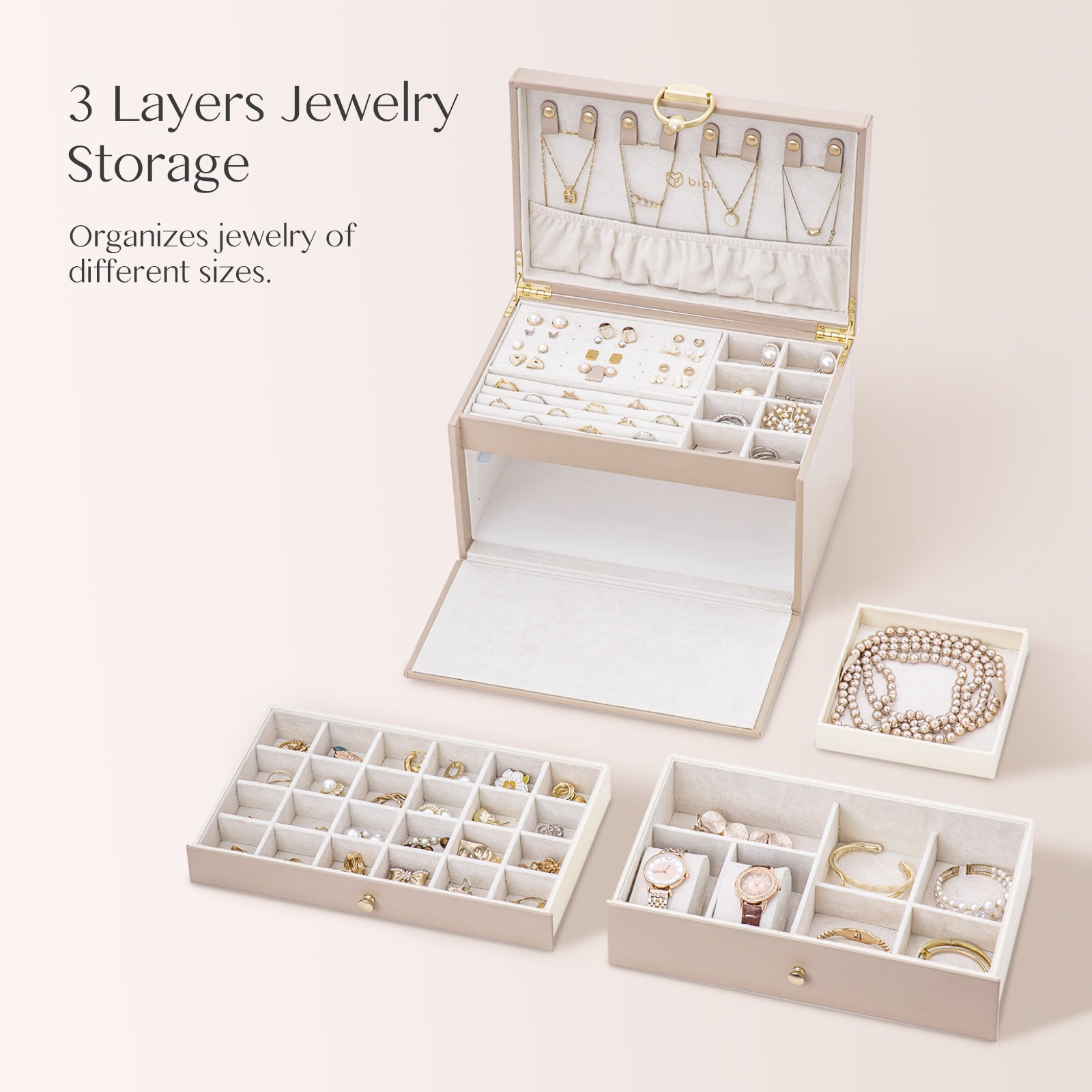 - Spacious & Organized Storage: This jewelry organizer features 3 layers and multiple compartments, providing ample space to neatly organize necklaces, earrings, rings, bracelets, and watches, keeping your precious jewelry in perfect order