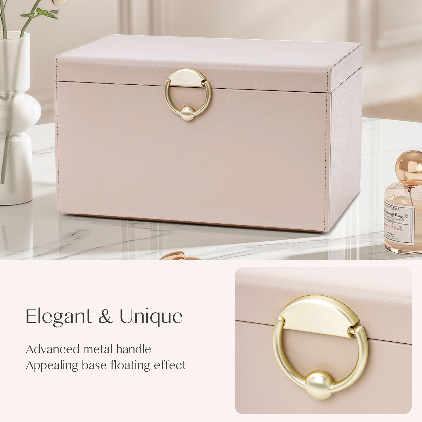 - Premium Material & Elegant Design: Jewelry box crafted with PU leather, adorned with exquisite handle, and appealing base floating effect, it not only offers durability but also adds a touch of elegance to your dressing table or bedroom decor