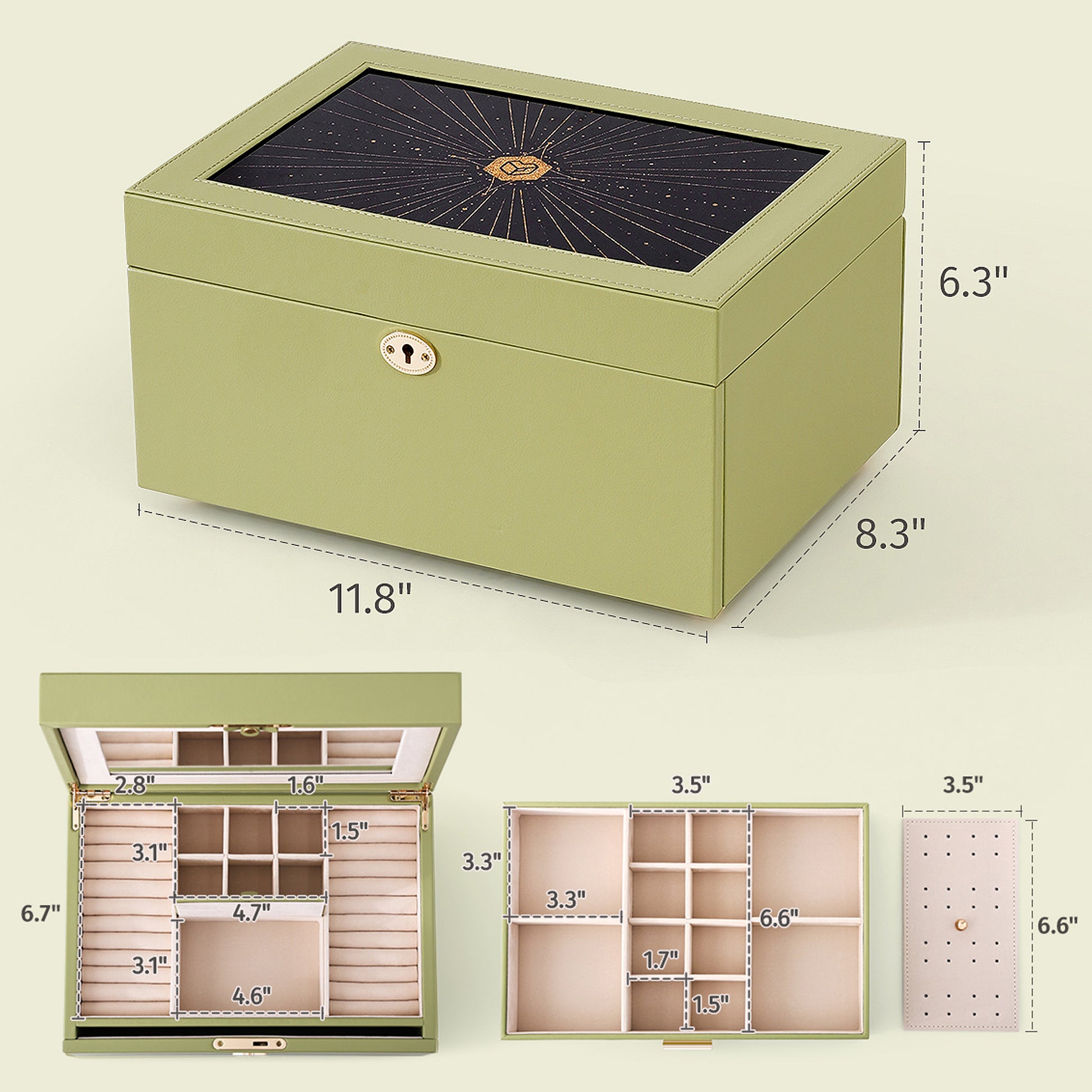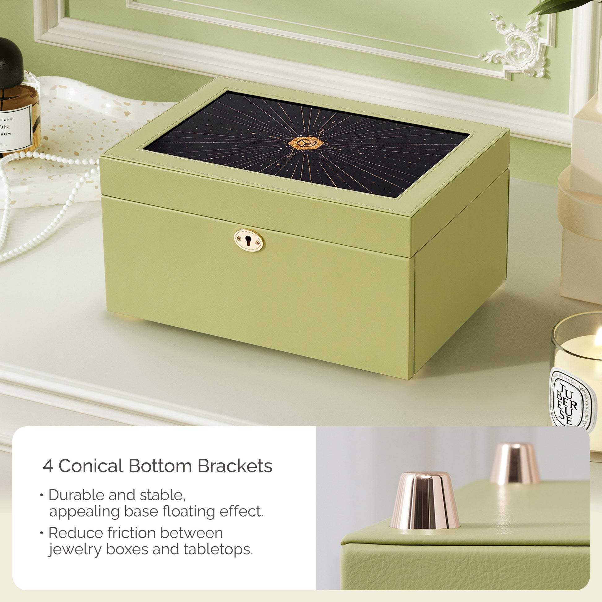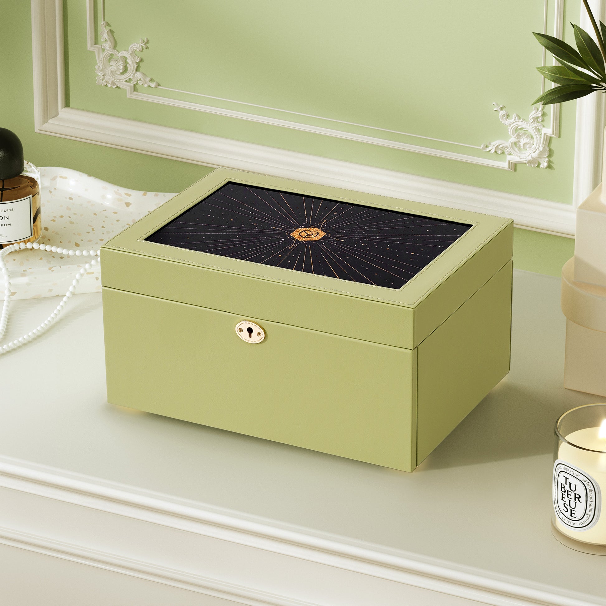 - Stylish & Original Design: This eye-catching jewelry box features a dazzling glass decoration and an elegant fusion of fresh green leather. The unique hardware accessories design creates a fashionable and beautiful visual effect.