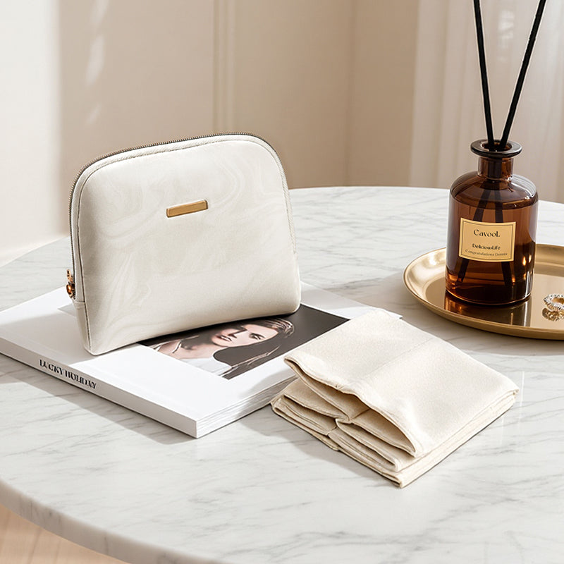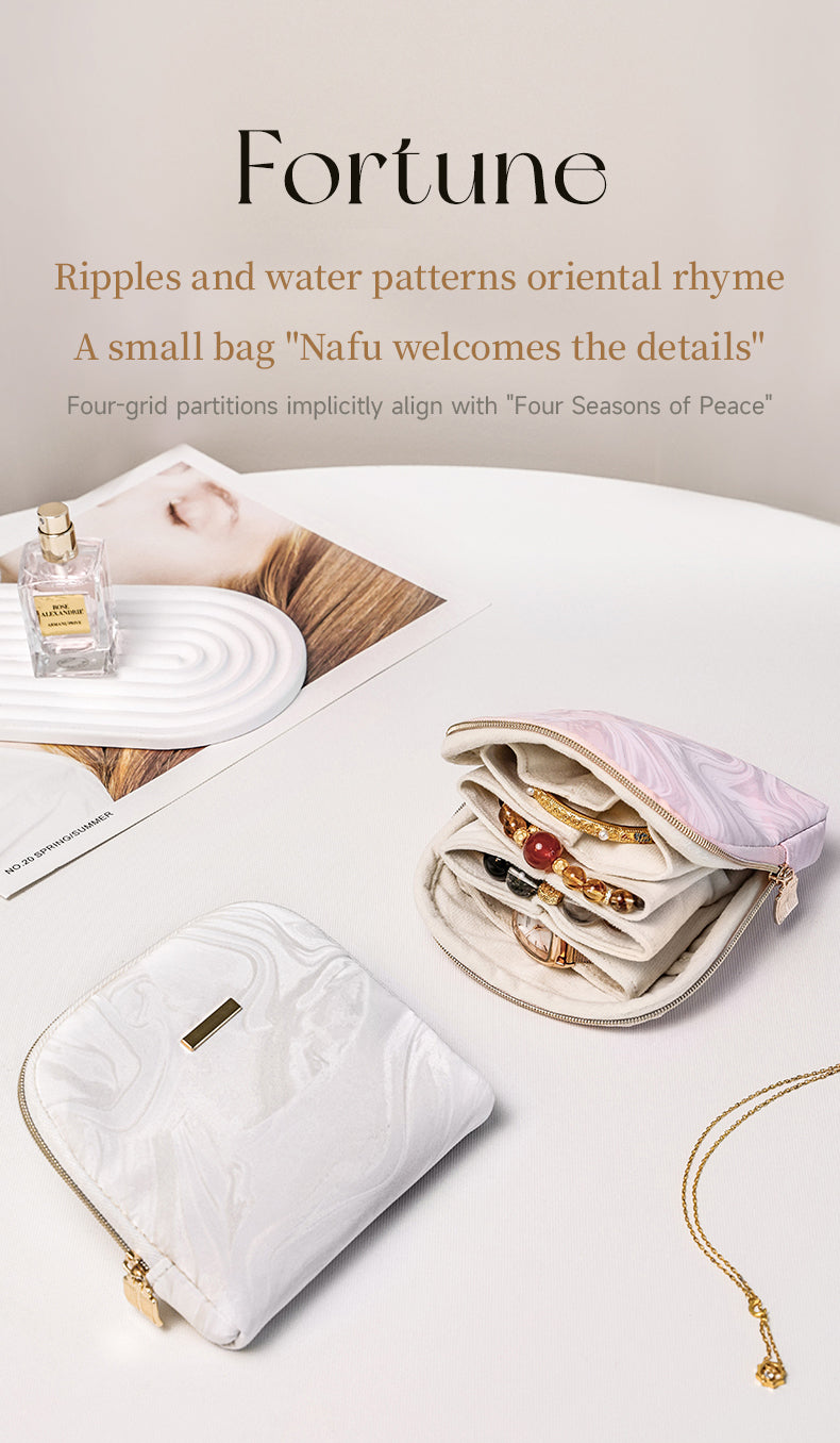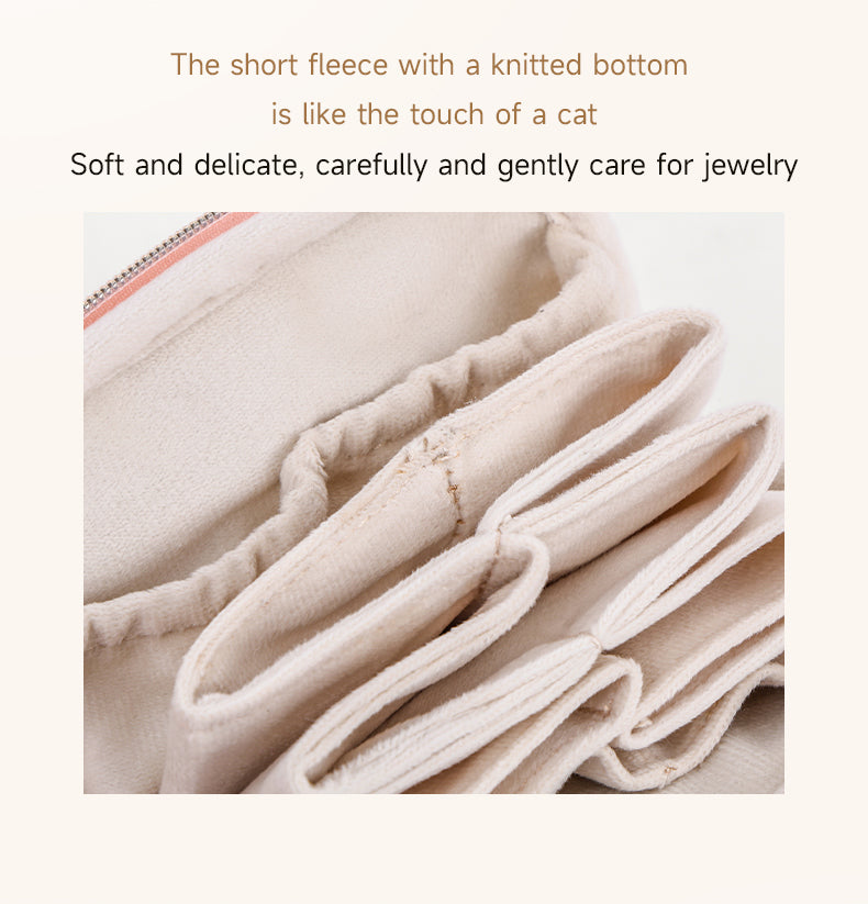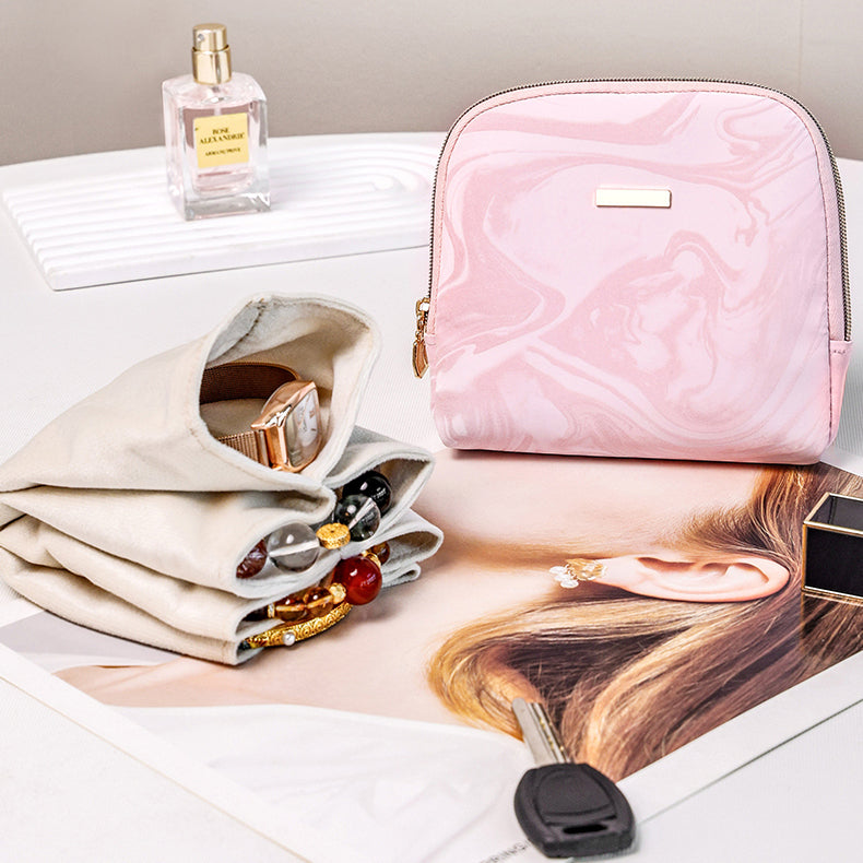 - Inside are 4 separate velvet pouches to keep necklaces, earrings and bracelets tangle-free. Elastic bands on both sides hold lipsticks or small cosmetics securely—ideal multi-purpose travel essential.